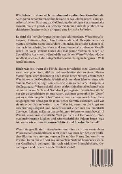 Wir leben in einer sich zunehmend spaltenden Gesellschaft. Auch wenn der amtierende Bundeskanzler das "Herbeireden" einer gesellschaftlichen Spaltung als Gefährdung des nötigen Zusammenhalts ansieht, braucht gerade ein herbeigeredeter und sich als gefährdet positionierter Zusammenhalt dringend eine kritische Reflexion. Es sind die Verschwörungstheoretiker, Aluhutträger, Wissenschaftsleugner, Putinversteher, Demokratiefeinde und Delegitimierer des Staates, schlichte Nazis und andere Gefährder, die uns das Leben in einer nach Fortschritt, Wahrheit und Zusammenhalt strebenden Gesellschaft im Wege stehen! Durch das mangelnde Vertrauen sehen sie überall böse Absichten, während die westlichen Werte Wohlstand, Gesundheit, aber auch die nötige Selbstbeschränkung in der ganzen Welt repräsentieren. Doch was ist, wenn die Feinde dieser fortschrittlichen Gesellschaft zwar meist polemisch, affektiv und unreflektiert sich zu einer diffusen Masse fügen, aber gleichzeitig doch etwas bitter Nötiges ansprechen? Was ist, wenn die Gesellschaftskritik nicht nur dem Schreien eines wütenden Mobs entspringt, sondern eine wissenschaftliche Disziplin, ja ein Zugang zur Wissenschaftlichkeit schlechthin darstellen kann? Was ist, wenn die mit Stolz und Nachdruck propagierten 'westlichen Werte' nur das zu verschleiern gelernt haben, was man gemeinhin im 'Osten' gut zu kritisieren gelernt hat? Was ist, wenn unsere westlichen Überzeugungen nur deswegen als moralisches Narrativ existieren, weil wir sie nie ordentlich reflektiert haben? Was ist, wenn nur die Angst vor Orientierungslosigkeit und Gesichtsverlust einer sich für moralisch überlegen haltenden Kultur uns vor bitteren Selbsterkenntnis bewahrt? Was ist, wenn unsere westliche Welt gar nicht auf Demokratie, informationsbringende Medien und wissenschaftliche Fakten baut? Was ist, wenn wir nur maßlos unreflektiert und überheblich sind? Wenn Sie gewillt sind mitzudenken und dies nicht nur verstaubten Wissenschaftlern überlassen, reißt Ihnen das Buch den Schleier westlicher Illusion herunter und versetzt Sie auf den Status Quo westlicher Realität. Denn nur von dort aus, im wachen Zustand, können wir zu einer Gesellschaft beitragen, die nach wirklicher Menschlichkeit, Gerechtigkeit und rücksichtsvoller Freiheit strebt!