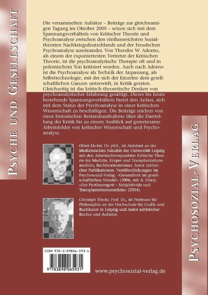 Die versammelten Aufsätze - Beiträge zur Tagung Medizinische Psychologie im Oktober 2005 - setzen sich mit dem Spannungsverhältnis von Kritischer Theorie und Psychoanalyse zwischen den einflussreichsten Sozialtheorien Nachkriegsdeutschlands und der Freudschen Psychoanalyse auseinander. Von Theodor W. Adorno, als einem der exponiertesten Vertreter der Kritischen Theorie, ist die psychoanalytische Therapie oft und in polemischem Ton kritisiert worden. Auch nach Adorno ist die Psychoanalyse als Technik der Anpassung, als Selbsttechnologie, mit der sich der Einzelne dem gesellschaftlichen Ganzen unterwirft, in Kritik geraten. Gleichzeitig ist das kritisch-theoretische Denken von psychoanalytischer Erfahrung gesättigt. Dieses bis heute bestehende Spannungsverhältnis bietet den Anlass, sich mit dem Status der Psychoanalyse in einer Kritischen Wissenschaft zu beschäftigen. Die Beiträge reichen von einer historischen Bestandsaufnahme über die Darstellung der Kritik bis zu einem Ausblick auf gemeinsame Arbeitsfelder von kritischer Wissenschaft und Psychoanalyse.