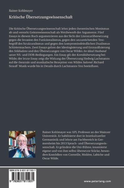Die Kritische Übersetzungswissenschaft lehnt jeden theoretischen Monismus ab und versteht Geisteswissenschaft als Wettbewerb der Argumente. Fünf Essays in diesem Buch argumentieren aus der Sicht der Literaturübersetzung gegen die Invasion des Funktionalismus, gegen den unzureichenden Textbegriff des Strukturalismus und gegen den kompromissfeindlichen Dualismus Schleiermachers. Zwei Essays gelten der Ideologisierung und Entnazifizierung des Stildudens und den Übersetzungen von Oscar Wildes An Ideal Husband unter NS- und DDR-Bedingungen. Ein Essay gilt der Komikübersetzung bei Wilde; der letzte Essay zeigt die Wirkung der Übersetzung Hedwig Lachmanns auf die theatrale und musikalische Rezeption von Wildes Salomé: Richard Strauß' Musik wurde bis in Details durch Lachmanns Text beeinflusst.