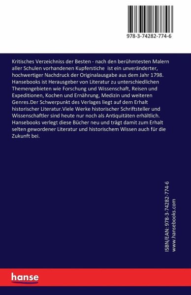 Kritisches Verzeichniss der Besten - nach den berühmtesten Malern aller Schulen vorhandenen Kupferstiche ist ein unveränderter, hochwertiger Nachdruck der Originalausgabe aus dem Jahr 1798.