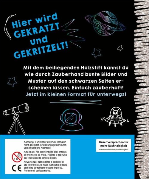 18 thematisch passende Hintergründe: Hinter der schwarzen Oberfläche warten die unterschiedlichsten HintergründeMit Kratzstift zum Sofortloslegen: Der Holzstift liegt gut in der Hand und zaubert schöne Effekte Mit Malideen: Zu jeder Karte gibt es tolle Anregungen, die für die Zusatzportion Kreativität sorgenFür unterwegs: Das Kratzelbuch ist der ideale Begleiter, ob zu Hause oder unterwegsToll als Geschenk: Ein ideales Geschenk für Weltraum-Fans ab 5 Jahren