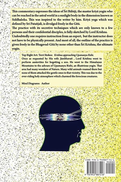 This precise and very revealing translation and commentary, exposes the kriya yoga techniques taught by Lord Krishna to Arjuna. This was inspired by Babaji Mahayogin, who uses a sunlight body and who imparted this information into the mind of the writer by mystic transfer. Kriya yoga techniques are secretive but in contrast, Lord Krishna divulged it openly to Arjuna. This volume shows this. It may free a reader from ineffective kriya techniques. For practicing yogis, it would confirm valid kriyas and show new approaches. This commentary expresses the ideas of Sri Babaji, the master kriy¿ yogin who can be reached in the astral world in a sunlight body in the dimension known as Siddhaloka. This was inspired to the writer by him. Kriy¿ yoga which was defined by Sri Patañjali, is divulged freely in the G¿t¿. The practice with its secretive techniques which are only known to a few persons and their confidential disciples, is fully sketched by Lord Krishna. Undoubtedly one requires instruction from an expert, but the instructor does not have to be physically present. And most of all, the outline of the practice is given freely in the Bhagavad-G¿t¿ by none other than ¿r¿ Krishna, the ultimate yogin.