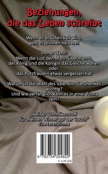 Der vierte Band der Serie Kröskenskisten enthält dreizehn Kurz (-e Beziehungs-) Geschichten, wie sie das Leben schreibt.Alle Geschichten decken Liebschaften und Affären auf. Denn wenn es draußen kalt wird, geht es drinnen heiß her.Immer dann: Wenn die Lust den Mann übermannt, der König und die Königin das Gleiche wollen oder das Putzfräulein etwas vergessen hat ...Warum ist die Wahl des Valentingeschenkes wichtig?Und wie verfänglich kann es in einer Firma sein?Aus einer der Geschichten entstand in Zusammenarbeit mit der Autorin Annie Royn ein mehrteiliger Erotik-Thriller.