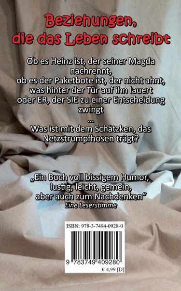Kurz (-e Beziehungs-) Geschichten, die das Leben schreibt.Ob es Heinz ist, der seiner Magda nachrennt, ob es der Paketbote ist, der nicht ahnt, was hinter der Tür auf ihn lauert oder ER, der SIE zu einer Entscheidung zwingt. Was ist mit dem Schätzken, das Netzstrumpfhosen trägt?Eine Geschichtensammlung voll bissigem Humor, lustig, leicht, gemein, aber auch zum Nachdenken.