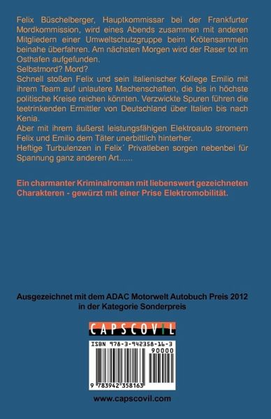 Felix Büschelberger, Hauptkommissar bei der Frankfurter Mordkommission, wird eines Abends zusammen mit anderen Mitgliedern einer Umweltschutzgruppe beim Krötensammeln beinahe überfahren. Am nächsten Morgen wird der Raser tot im Osthafen aufgefunden. Selbstmord? Mord? Schnell stoßen Felix und sein italienischer Jugendfreund und Kollege Emilio mit ihrem Team auf unlautere Machenschaften, die bis in höchste politische Kreise reichen könnten. Verzwickte Spuren führen die teetrinkenden Ermittler von Deutschland über Italien bis nach Kenia. In den unterschiedlichste Welten sind die scheinbaren Saubermänner genauso verdächtig wie schwule und verzweifelte Stricher. Mit Hilfe des kettenrauchenden Chefpathologen Dr. Kevin Murr und ausgefeilter Technik werden knifflige Rätsel aufgelöst, doch immer neue entstehen. Aber mit ihrem äußerst leistungsfähigen Elektro-Auto stromern Felix und Emilio dem Täter unerbittlich hinterher. Heftige Turbulenzen in Felix¿ Privatleben sorgen nebenbei für Spannung ganz anderen Art ...... Ein charmanter Kriminalroman mit liebenswert gezeichneten Charakteren - gewürzt mit einer Prise Elektromobilität.