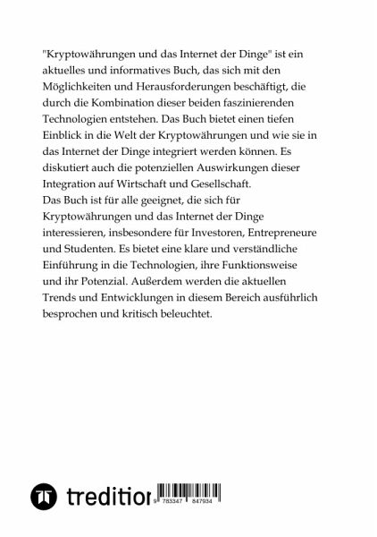 "Kryptowährungen und das Internet der Dinge" ist ein aktuelles und informatives Buch, das sich mit den Möglichkeiten und Herausforderungen beschäftigt, die durch die Kombination dieser beiden faszinierenden Technologien entstehen. Das Buch bietet einen tiefen Einblick in die Welt der Kryptowährungen und wie sie in das Internet der Dinge integriert werden können. Es diskutiert auch die potenziellen Auswirkungen dieser Integration auf Wirtschaft und Gesellschaft.Das Buch ist für alle geeignet, die sich für Kryptowährungen und das Internet der Dinge interessieren, insbesondere für Investoren, Entrepreneure und Studenten. Es bietet eine klare und verständliche Einführung in die Technologien, ihre Funktionsweise und ihr Potenzial. Außerdem werden die aktuellen Trends und Entwicklungen in diesem Bereich ausführlich besprochen und kritisch beleuchtet.Insgesamt ist "Kryptowährungen und das Internet der Dinge" ein umfassendes und gut recherchiertes Buch, das einen wertvollen Beitrag zum Verständnis dieser Technologien leistet. Es hilft dem Leser, die Chancen und Risiken zu verstehen und beleuchtet auch die Auswirkungen auf die Zukunft. Ein unverzichtbares Buch für alle, die an der Zukunft von Kryptowährungen und dem Internet der Dinge interessiert sind.