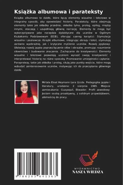 Ksi¿¿ka albumowa to dzie¿o, które ¿¿czy elementy wizualne i tekstowe w integralny sposób, aby opowiedzie¿ histori¿. Parateksty, które obejmuj¿ elementy takie jak ok¿adka przednia, ok¿adka tylna, prolog, epilog, mi¿dzy innymi, otaczaj¿ i uzupe¿niaj¿ g¿ówn¿ narracj¿. Elementy te mog¿ by¿ wykorzystywane jako narz¿dzia dydaktyczne dla uczniów w Ogólnym Ksztäceniu Podstawowym (EGB), oferuj¿c szereg korzy¿ci: Stymulacja wizualna i poznawcza: Ksi¿¿ki albumowe, integruj¿c obrazy i tekst, stymuluj¿ zarówno wyobräni¿, jak i krytyczne my¿lenie uczniów. Rozwój j¿zykowy: U¿atwiaj¿ rozwój j¿zyka poprzez ¿¿czenie s¿ów i obrazów, promuj¿c rozumienie s¿ownictwa i budowanie znaczenia. Zach¿canie do kreatywno¿ci: Elementy wizualne i tekstowe pozwalaj¿ uczniom wyrazi¿ swoj¿ kreatywno¿¿ i interpretowä histori¿ na ró¿ne sposoby. Promowanie umiej¿tno¿ci czytania: Paraprotezy, takie jak ok¿adka i prolog, s¿u¿¿ jako punkty wej¿cia, które mog¿ wzbudzi¿ zainteresowanie uczniów, motywuj¿c ich do przeczytania g¿ównego dzie¿a.