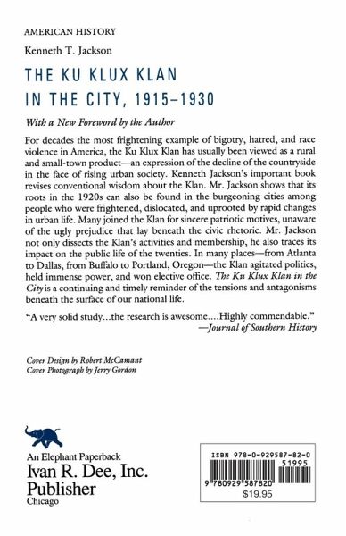 For decades the most frightening example of bigotry and hatred in America, the Ku Klux Klan has usually been seen as a rural and small-town product-an expression of the decline of the countryside in the face of rising urban society. Kenneth Jackson's important book revises conventional wisdom about the Klan. He shows that its roots in the 1920s can also be found in burgeoning cities among people who were frightened, dislocated, and uprooted by rapid changes in urban life. Many joined the Klan for sincere patriotic motives, unaware of the ugly prejudice that lay beneath the civic rhetoric. Mr. Jackson not only dissects the Klan's activities and membership, he also traces its impact on the public life of the twenties. In many places-from Atlanta to Dallas, from Buffalo to Portland, Oregon-the Klan agitated politics, held immense power, and won elective office. The Ku Klux Klan in the City is a continuing and timely reminder of the tensions and antagonisms beneath the surface of our national life. "Comprehensively researched, methodically organized, lucidly written...a book to be respected."-Journal of American History.