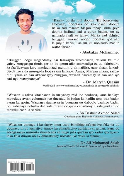 Buuggan Ku Raaxayso Noloshaada, wuxuu kuu soo bandhigi doonaa talaabo kasta oo aad u baahan tahay in aad qaaddo, si aad u heshid raaxada nolosha, dhanka ruuxda, maskaxda, qalbiga, jirka iyo dadka. Waxaadna ka baran doontaa sida loo nooleeyo rejadaada marka ay noloshaadu mugdi gasho! Buuggan kuuma sheegi doono oo kaliya sida lagu gaaro raaxada nolosha, balse wuxuu kuu sheegi doonaa talaabooyin (practical) ah iyo talooyin waxtar leh oo aad ku jaangoyn karto noloshaada. Dhammaan waxa ku qoran buuggan ma ahan mid ku dhisan qof fikirkiisa, balse wuxuu ka kooban yahay waxyaabaha saldhig (tiir) u ah farxadda. Haddii aad jeceshahay inaad marwalba faraxsanaato oo noloshaada ku qaadato farxad, waxaad heshay fursaddii ugu weynayd! Akhri buuggan oo baro halka laga helo raaxada nolosha.