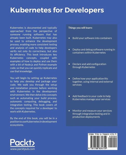 A developer's field-guide to designing scalable services using Kubernetes Key Features Develop and run your software using containers within a Kubernetes environment Get hands-on experience of using Kubernetes with DevOps concepts such as continuous integration, benchmark testing, monitoring, and so on Pragmatic example-based approach showing how to use Kubernetes in the development process Book Description Kubernetes is documented and typically approached from the perspective of someone running software that has already been built. Kubernetes may also be used to enhance the development process, enabling more consistent testing and analysis of code to help developers verify not only its correctness, but also its efficiency. This book introduces key Kubernetes concepts, coupled with examples of how to deploy and use them with a bit of Node.js and Python example code, so that you can quickly replicate and use that knowledge. You will begin by setting up Kubernetes to help you develop and package your code. We walk you through the setup and installation process before working with Kubernetes in the development environment. We then delve into concepts such as automating your build process, autonomic computing, debugging, and integration testing. This book covers all the concepts required for a developer to work with Kubernetes. By the end of this book, you will be in a position to use Kubernetes in development ecosystems. What you will learn Build your software into containers. Deploy and debug software running in containers within Kubernetes. Declare and add configuration through Kubernetes. Define how your application fits together, using internal and external services. Add feedback to your code to help Kubernetes manage your services Monitor and measure your services through integration testing and in production deployments.