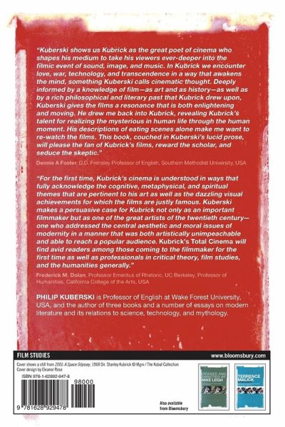 Philip Kuberski's review of Kubrick's films, Kubrick's Total Cinema, masterfully links the grandest themes of those films to the most intimate of physical details. He shows us Kubrick as the great poet of cinema who shapes his medium to take his viewers ever-deeper into the filmic event of sound, image, and music. In Kubrick we encounter love, war, technology and transcendence in a way that awakens the mind, something Kuberski calls cinematic thought. Deeply informed by a knowledge of film--as art and as history-as well as by a rich philosophical and literary past that Kubrick drew upon, Kuberski gives the films a resonance that is both enlightening and moving. He drew me back into Kubrick, revealing Kubrick's talent for realizing the mysterious in human life through the human moment. His descriptions of eating scenes alone make me want to re-watch the films. This book, couched in Kuberski's lucid prose, will please the fan of Kubrick's films, reward the scholar, and seduce the skeptic. Dennis A Foster, D.D. Frensley Professor of English, Southern Methodist University