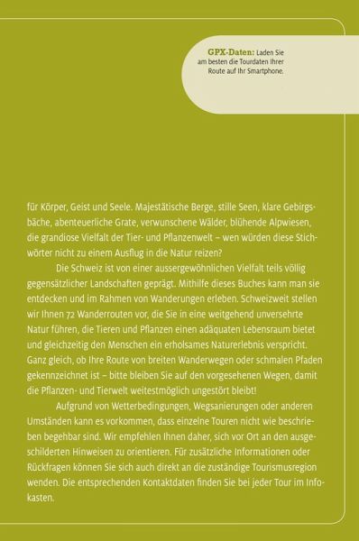 COUCH-POTATOES WAREN GESTERN - heute ist aktive Freizeitgestaltung angesagt. Ob Spaß und Spannung, Action und Unterhaltung oder Einblicke in Unbekanntes - Ausflüge in die Natur, in Städte und zu Sehenswürdigkeiten liegen im Trend. Und das Angebot ist unüberschaubar. Hier hilft Erlebnis Schweiz - mit 32 Bänden voller Tipps und Empfehlungen für eine aktive Freizeit und Infos zu spektakulären, trendigen, (ent-)spannenden und ausgefallenen Touren und Zielen. Der Band "Wandern in unberührter Natur" führt Sie auf den 71 sorgfältig ausgewählten Routen durch Schluchten, Wälder, Weiden und Berge in wenig frequentierten Schweizer Landschaften, ideal für ein einzigartiges Naturerlebnis, Abenteuer und Erholung.