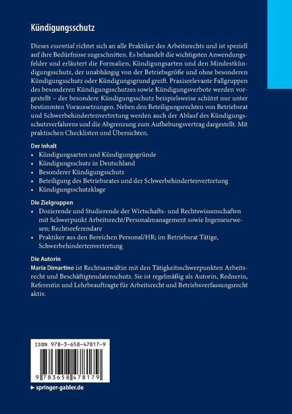 Dieses essential richtet sich an alle Praktiker des Arbeitsrechts und ist speziell auf ihre Bedürfnisse zugeschnitten. Es behandelt die wichtigsten Anwendungsfelder und erläutert die Formalien, Kündigungsarten und den Mindestkündigungsschutz, der unabhängig von der Betriebsgröße und ohne besonderen Kündigungsschutz oder Kündigungsgrund greift. Praxisrelevante Fallgruppen des besonderen Kündigungsschutzes sowie Kündigungsverbote werden vorgestellt der besondere Kündigungsschutz beispielsweise schützt nur unter bestimmten Voraussetzungen. Neben den Beteiligungsrechten von Betriebsrat und Schwerbehindertenvertretung werden auch der Ablauf des Kündigungsschutzverfahrens und die Abgrenzung zum Aufhebungsvertrag dargestellt. Mit praktischen Checklisten und Übersichten.