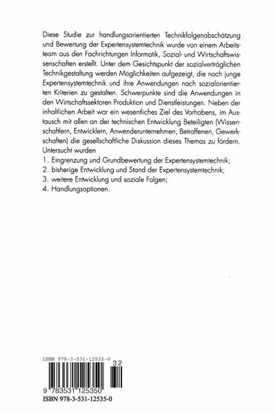 2. Problemdarstellung und Ziele des Projektes.- 3. Technikeingrenzung und -bewertung.- 3.1 Einleitung.- 3.2 Probleme der disziplinären Einordnung.- 3.3 Die philosophischen Annahmen der Künstlichen Intelligenz.- 3.4 Cognitive-Science-KI und Informatik-KI.- 3.5 Anwendungsorientierte Richtungen der KI.- 3.6 Wissensbasierte Systeme.- 3.7 Expertensysteme.- 3.8 Potential und Grenzen von Expertensystemen.- 3.9 Tradition und neue Qualität.- 4. Stand der Entwicklung.- 4.1 Kurzer Abriß zur Geschichte der KI.- 4.2 KI-Förderung in der Bundesrepublik.- 4.3 Diffusion und Art der Anwendungen.- 4.4 Unternehmerische Ziele für den Expertensystemeinsatz.- 4.5 Expertensysteme in den USA und Japan.- 5. Vorliegende Prognosen über die Zukunft der Expertensystemtechnik und die sozialen Folgen.- 5.1 Marktstudien.- 5.2 Visionen von KI-Forschern.- 5.3 Kritische KI-Forscher.- 5.4 Studien zur Technikfolgenabschätzung.- 6. Technikfolgenabschätzung mit der Szenariomethode.- 7. Zwei alternative Szenarien.- 7.1 Der technikzentrierte Entwicklungspfad.- 7.2 Der humanzentrierte Entwicklungspfad.- 8. Handlungsoptionen zur sozialorientierten Gestaltung der Expertensystemtechnik.- 8.1 Einleitung.- 8.2 Menschengerechte Gestaltung von Arbeit und Technik.- 8.3 Wirtschaft.- 8.4 Politik.- 8.5 Gesellschaft.- 9. Technikfolgenabschätzung.- 9.1 Fortführung des TA-Prozesses.- 9.2 Erfahrungen aus unserem TA-Projekt.- 9.3 Erfahrungen mit den von uns verwendeten Methoden.- 10. Literaturverzeichnis.