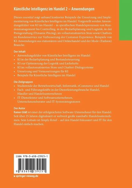 Dieses essential zeigt anhand konkreter Beispiele die Umsetzung und Implementierung von Künstlicher Intelligenz im Handel. Vorgestellt werden Anwendungsfelder von KI im Handel - in spezifischen Handelsprozessen von Kundenmanagement bis Controlling, in der Bedarfsplanung und Logistik, in der Preisgestaltung (Dynamic Pricing), im vollautomatisierten Store sowie Chatbots im Kundenservice zur Verbesserung der Customer Experience. Beispiele von KI-Anwendungen aus stationärem und Onlinehandel und der Mode-(Fashion)Branche.