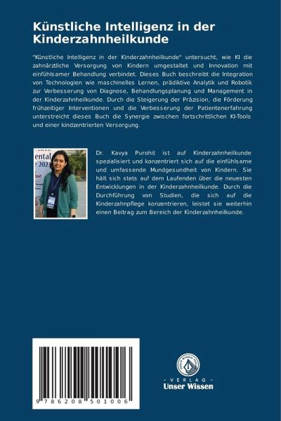 "Künstliche Intelligenz in der Kinderzahnheilkunde" untersucht, wie KI die zahnärztliche Versorgung von Kindern umgestaltet und Innovation mit einfühlsamer Behandlung verbindet. Dieses Buch beschreibt die Integration von Technologien wie maschinelles Lernen, prädiktive Analytik und Robotik zur Verbesserung von Diagnose, Behandlungsplanung und Management in der Kinderzahnheilkunde. Durch die Steigerung der Präzision, die Förderung frühzeitiger Interventionen und die Verbesserung der Patientenerfahrung unterstreicht dieses Buch die Synergie zwischen fortschrittlichen KI-Tools und einer kindzentrierten Versorgung.
