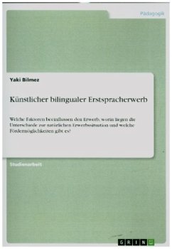 Studienarbeit aus dem Jahr 2018 im Fachbereich Didaktik - Deutsch - Deutsch als Fremdsprache, Note: 1,7, Ludwig-Maximilians-Universität München, Sprache: Deutsch, Abstract: In dieser Arbeit soll die Situation des künstlichen bilingualen Erstspracherwerb untersucht werden und welche Fördermöglichkeiten in Frage kommen. Dabei soll zunächst diese Erwerbsituation abgegrenzt und definiert werden. Im weiteren Verlauf werden Faktoren und ein Fall künstlicher bilingualer Zweisprachigkeitserziehung vorgestellt, sowie Unterschiede zur natürlichen Zweisprachigkeitserziehung dargestellt. Abschließend werden mögliche Fördermöglichkeiten genannt, die in Aufrechterhaltung und Verbesserung der sprachlichen Kompetenzen der Heranwachsenden resultieren sollen.