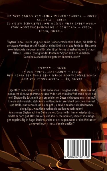 Die neue Staffel von 'Emily in Paris' suchten - checkSchlafen - checkSo vielen Schutzengel wie möglich nicht enden wollende Nervenzusammenbrüche bescheren - check, check, check ...Shytans To-do-Liste ist lang, seit seine Brüder entschieden haben, die Hölle zu verlassen. Vermisst er sie? Natürlich nicht! Endlich ist das Reich der Finsternis so effizient wie nie zuvor und löst damit bei Petrus stressbedingten Bartausfall aus. Dessen Lösung für das Problem: Shytan soll sich verlieben.Da sollte Alana doch wie gerufen kommen, oder? Sterben - checkin den Himmel einbrechen - checkden Herrn der Hölle…mehr