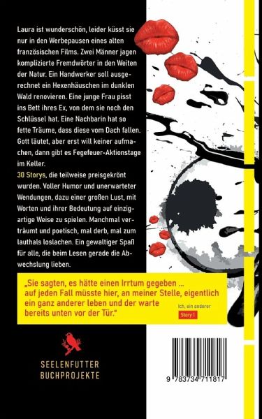 Laura ist wunderschön, leider küsst sie nur in den Werbepausen eines alten französischen Films. Zwei Männer jagen komplizierte Fremdwörter in den Weiten der Natur. Ein Handwerker soll ausgerechnet ein Hexenhäuschen im dunklen Wald renovieren. Eine junge Frau pisst ins Bett ihres Ex, von dem sie noch den Schlüssel hat. Eine Nachbarin hat so fette Träume, dass diese vom Dach fallen. Gott läutet, aber erst will keiner aufmachen, dann gibt es Fegefeuer-Aktionstage im Keller.30 Storys, die teilweise preisgekrönt wurden. Voller Humor und unerwarteter Wendungen, dazu einer großen Lust, mit Worten und ihrer Bedeutung auf einzigartige Weise zu spielen. Manchmal verträumt und poetisch, mal derb, mal zum lauthals loslachen. Ein gewaltiger Spaß für alle, die beim Lesen gerade die Abwechslung lieben.