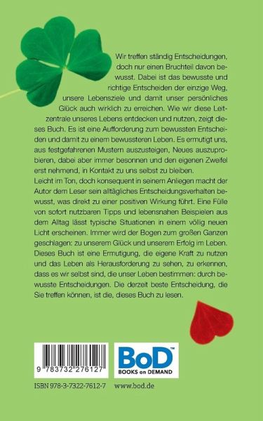 Wir treffen ständig Entscheidungen, doch nur einen Bruchteil davon bewusst. Dabei ist das bewusste und richtige Entscheiden der einzige Weg, unsere Lebensziele und damit unser persönliches Glück auch wirklich zu erreichen. Wie wir diese Leitzentrale unseres Lebens entdecken und nutzen, zeigt dieses Buch. Es ist eine Aufforderung zum bewussten Entscheiden und damit zu einem bewussteren Leben. Es ermutigt uns, aus festgefahrenen Mustern auszusteigen, Neues auszuprobieren, dabei aber immer besonnen und den eigenen Zweifel erst nehmend, in Kontakt zu uns selbst zu bleiben.Leicht im Ton, doch konsequent in seinem Anliegen macht der Autor dem Leser sein alltägliches Entscheidungsverhalten bewusst, was direkt zu einer positiven Wirkung führt. Eine Fülle von sofort nutzbaren Tipps und lebensnahen Beispielen aus dem Alltag lässt typische Situationen in einem völlig neuen Licht erscheinen. Immer wird der Bogen zum großen Ganzen geschlagen: zu unserem Glück und unserem Erfolg im Leben.Dieses Buch ist eine Ermutigung, die eigene Kraft zu nutzen und das Leben als Herausforderung zu sehen, zu erkennen, dass es wir selbst sind, die unser Leben bestimmen: durch bewusste Entscheidungen. Die derzeit beste Entscheidung, die Sie treffen können, ist die, dieses Buch zu lesen.