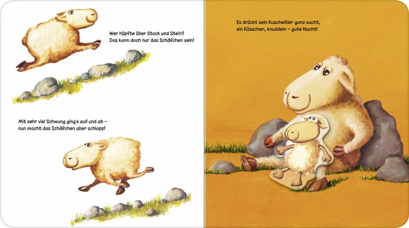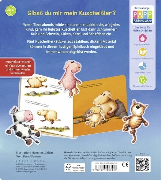 Küken, Katze, Kuh, Schwein und Schaf fallen schon fast die Augen zu. Zum Einschlafen fehlen jetzt nur noch ihre Kuscheltiere! Doch wem gehört welches? Eine lustige Reimgeschichte mit abwaschbaren, immer wieder verwendbaren Kuscheltier-Stickern.