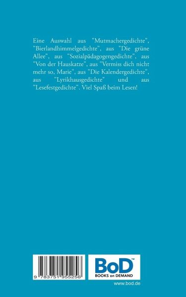 Eine Auswahl aus "Mutmachergedichte", "Bierlandhimmelgedichte", aus "Die grüne Allee", aus "Sozialpädagogengedichte", aus "Von der Hauskatze", aus "Vermiss dich nicht mehr so, Marie", aus "Die Kalendergedichte", aus "Lyrikhausgedichte" und aus "Lesefestgedichte". Viel Spaß beim Lesen!