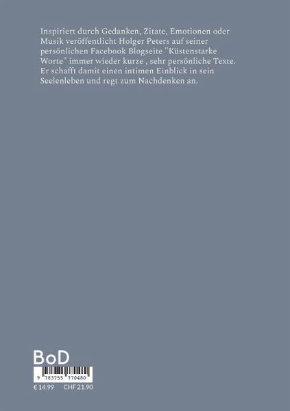 Inspiriert durch Gedanken, Zitate, Emotionen oder Musik veröffentlicht Holger Peters auf seiner persönlichen Facebook Blogseite "Küstenstarke Worte" immer wieder kurze , sehr persönliche Texte. Er schafft damit einen intimen Einblick in sein Seelenleben und regt zum Nachdenken an.
