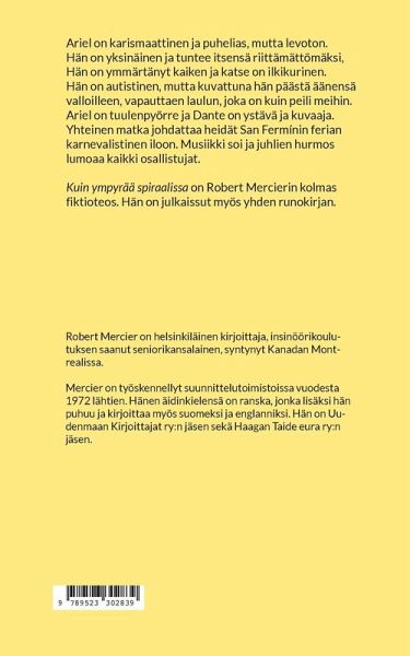 Ariel on karismaattinen ja puhelias, mutta levoton. Hän on yksinäinen ja tuntee itsensä riittämättömäksi, Hän on ymmärtänyt kaiken ja katse on ilkikurinen. Hän on autistinen, mutta kuvattuna hän päästä äänensä valloilleen, vapauttaen laulun, joka on kuin peili meihin. Ariel on tuulenpyörre ja Dante on ystävä ja kuvaaja. Yhteinen matka johdattaa heidät San Fermínin ferian karnevalistinen iloon. Musiikki soi ja juhlien hurmos lumoaa kaikki osallistujat. Kuin ympyrää spiraalissa on Robert Mercierin kolmas fiktioteos. Hän on julkaissut myös yhden runokirjan.