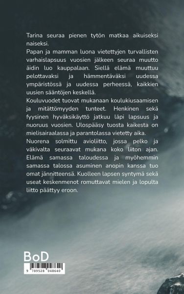 Tarina seuraa pienen tytön matkaa aikuiseksi naiseksi. Papan ja mamman luona vietettyjen turvallisten varhaislapsuus vuosien jälkeen seuraa muutto äidin luo kauppalaan. Siellä elämä muuttuu pelottavaksi ja hämmentäväksi uudessa ympäristössä ja uudessa perheessä, kaikkien uusien sääntöjen keskellä. Kouluvuodet tuovat mukanaan koulukiusaamisen ja mitättömyyden tunteet. Henkinen sekä fyysinen hyväksikäyttö jatkuu läpi lapsuus ja nuoruus vuosien. Ulospääsy tuosta kaikesta on mielisairaalassa ja parantolassa vietetty aika. Nuorena solmittu avioliitto, jossa pelko ja väkivalta seuraavat mukana koko liiton ajan. Elämä samassa taloudessa ja myöhemmin samassa talossa asuminen anopin kanssa tuo omat jännitteensä. Kuolleen lapsen syntymä sekä useat keskenmenot romuttavat mielen ja lopulta liitto päättyy eroon.
