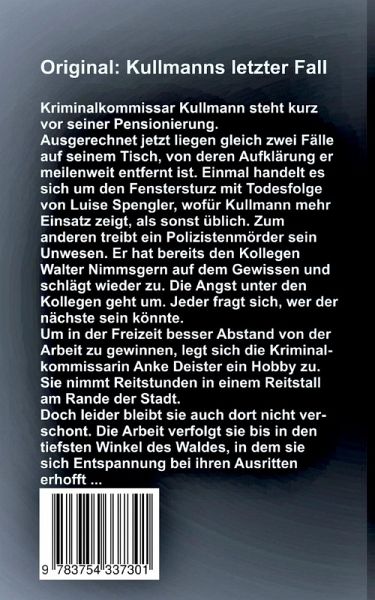 Kriminalhauptkommissar Kullmann steht kurz vor seiner Pensionierung. Ausgerechnet jetzt liegen gleich zwei Fälle auf seinem Tisch, von deren Aufklärung er meilenweit entfernt ist. Einmal handelt es sich um den Fenstersturz mit Todesfolge von Luise Spengler, wofür Kullmann mehr Einsatz zeigt, als sonst üblich. Zum anderen treibt ein Polizistenmörder sein Unwesen. Er hat bereits den Kollegen Walter Nimmsgern auf dem Gewissen und schlägt wieder zu. Die Angst unter den Kollegen geht um. Jeder fragt sich, wer der nächste sein könnte.Um in der Freizeit besser Abstand von der Arbeit zu gewinnen, legt sich die Kriminalkommissarin Anke Deister ein Hobby zu. Sie nimmt Reitstunden in einem Reitstall am Rande der Stadt. Doch leider bleibt sie auch dort nicht verschont, denn die Arbeit verfolgt sie bis in den tiefsten Winkel des Waldes, in dem sie sich Entspannung bei ihren Ausritten erhofft ...