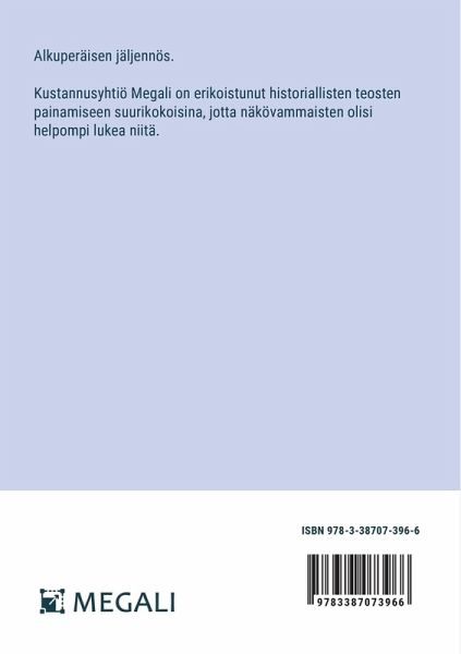 Alkuperäisen jäljennös. Kustannusyhtiö Megali on erikoistunut historiallisten teosten painamiseen suurikokoisina, jotta näkövammaisten olisi helpompi lukea niitä.