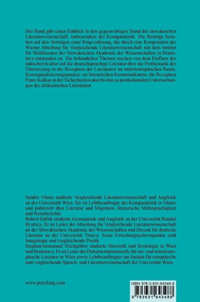 Der Band gibt einen Einblick in den gegenwärtigen Stand der slowakischen Literaturwissenschaft, insbesondere der Komparatistik. Die Beiträge beruhen auf den Vorträgen einer Ringvorlesung, die durch eine Kooperation der Wiener Abteilung für Vergleichende Literaturwissenschaft mit dem Institut für Weltliteratur der Slowakischen Akademie der Wissenschaften in Bratislava entstanden ist. Die behandelten Themen reichen von dem Einfluss der indischen Kultur auf die deutschsprachige Literatur über die Problematik der Übersetzung in der Rezeption der Literaturen im mitteleuropäischen Raum, Konzeptualisierungsansätze zur literarischen Kommunikation, die Rezeption Franz Kafkas in der Tschechoslowakei bis hin zu postkolonialen Untersuchungen der afrikanischen Literaturen.