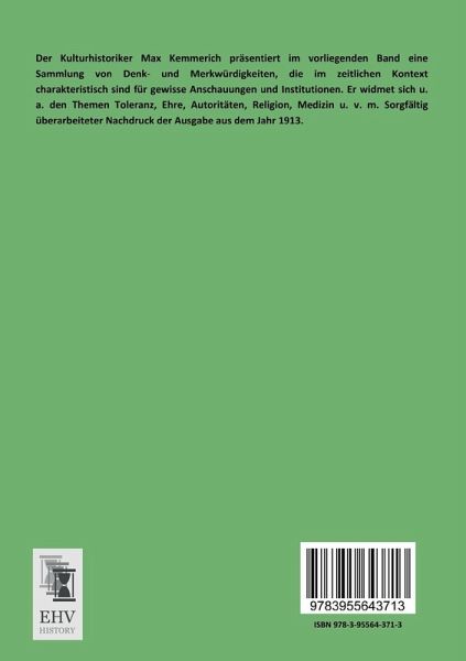 Der Kulturhistoriker Max Kemmerich präsentiert im vorliegenden Band eine Sammlung von Denk- und Merkwürdigkeiten, die im zeitlichen Kontext charakteristisch sind für gewisse Anschauungen und Institutionen. Er widmet sich u. a. den Themen Toleranz, Ehre, Autoritäten, Religion, Medizin u. v. m. Sorgfältig überarbeiteter Nachdruck der Ausgabe aus dem Jahr 1913.