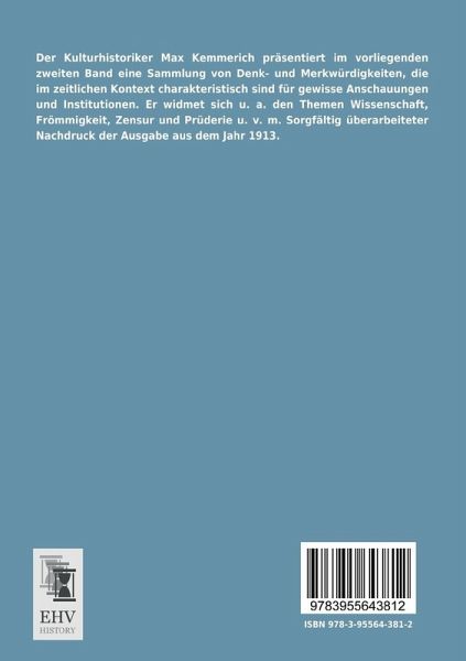 Der Kulturhistoriker Max Kemmerich präsentiert im vorliegenden zweiten Band eine Sammlung von Denk- und Merkwürdigkeiten, die im zeitlichen Kontext charakteristisch sind für gewisse Anschauungen und Institutionen. Er widmet sich u. a. den Themen Wissenschaft, Frömmigkeit, Zensur und Prüderie u. v. m. Sorgfältig überarbeiteter Nachdruck der Ausgabe aus dem Jahr 1913.