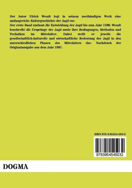 Der Autor Ulrich Wendt legt in seinem zweibändigen Werk eine umfangreiche Kulturgeschichte der Jagd vor. Der erste Band umfasst die Entwicklung der Jagd bis zum Jahr 1500. Wendt beschreibt die Ursprünge der Jagd sowie ihre Bedingungen, Methoden und Techniken im Mittelalter. Dabei stellt er jeweils die gesellschaftlich-kulturelle und wirtschaftliche Bedeutung der Jagd in den unterschiedlichen Phasen des Mittelalters dar. Nachdruck der Originalausgabe aus dem Jahr 1907.