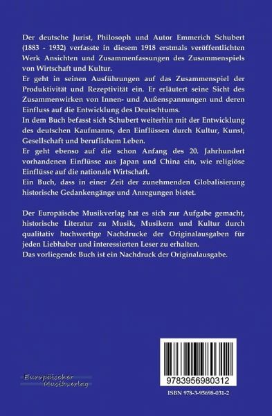 Der deutsche Jurist, Philosoph und Autor Emmerich Schubert (1883 - 1932) verfasste in diesem 1918 erstmals veröffentlichten Werk Ansichten und Zusammenfassungen des Zusammenspiels von Wirtschaft und Kultur.