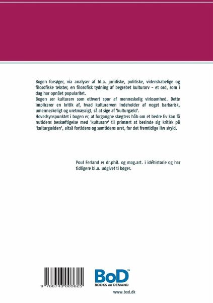 Siden dette århundredes begyndelse er ordet kulturarv i stigende grad blevet benyttet med forkærlighed af såvel politikere som journalister, menigmand og fagfolk. Tolkningen af begrebet har imidlertid taget sig forskellig ud; fx har nogle - og nok de fleste - tolket det med en national betoning, mens andre har betonet det internationale eller universelle. Nærværende bog forsøger via undersøgelser af bl.a. juridiske, politiske, videnskabelige og filosofiske tekster en filosofisk tydning af begrebet. Den ser kulturarv bestemt som ethvert spor af menneskelig virksomhed. Dette implicerer ikke mindst en kritik af, hvad kulturarven indeholder af noget barbarisk, umenneskeligt og uretmæssigt. Derfor er hovedsynspunktet i denne bog, at forgangne slægters håb om et bedre liv bør få nutidens beskæftigelse med 'kulturarven' til primært at se kritisk på 'kulturgælden', altså fortidens og samtidens uret, for det fremtidige livs skyld.