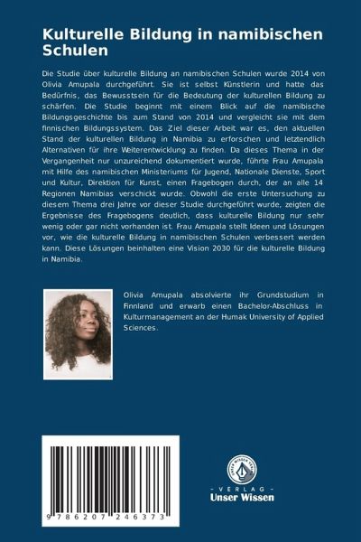 Die Studie über kulturelle Bildung an namibischen Schulen wurde 2014 von Olivia Amupala durchgeführt. Sie ist selbst Künstlerin und hatte das Bedürfnis, das Bewusstsein für die Bedeutung der kulturellen Bildung zu schärfen. Die Studie beginnt mit einem Blick auf die namibische Bildungsgeschichte bis zum Stand von 2014 und vergleicht sie mit dem finnischen Bildungssystem. Das Ziel dieser Arbeit war es, den aktuellen Stand der kulturellen Bildung in Namibia zu erforschen und letztendlich Alternativen für ihre Weiterentwicklung zu finden. Da dieses Thema in der Vergangenheit nur unzureichend dokumentiert wurde, führte Frau Amupala mit Hilfe des namibischen Ministeriums für Jugend, Nationale Dienste, Sport und Kultur, Direktion für Kunst, einen Fragebogen durch, der an alle 14 Regionen Namibias verschickt wurde. Obwohl die erste Untersuchung zu diesem Thema drei Jahre vor dieser Studie durchgeführt wurde, zeigten die Ergebnisse des Fragebogens deutlich, dass kulturelle Bildung nur sehr wenig oder gar nicht vorhanden ist. Frau Amupala stellt Ideen und Lösungen vor, wie die kulturelle Bildung in namibischen Schulen verbessert werden kann. Diese Lösungen beinhalten eine Vision 2030 für die kulturelle Bildung in Namibia.