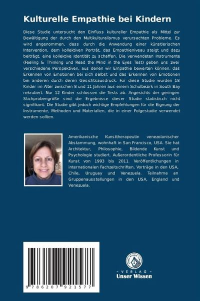 Diese Studie untersucht den Einfluss kultureller Empathie als Mittel zur Bewältigung der durch den Multikulturalismus verursachten Probleme. Es wird angenommen, dass durch die Anwendung einer künstlerischen Intervention, dem kollektiven Porträt, das Empathieniveau steigt und dazu beiträgt, eine kollektive Identität zu schaffen. Die verwendeten Instrumente (Feeling & Thinking und Read the Mind in the Eyes Test) geben uns zwei verschiedene Perspektiven, aus denen wir Empathie bewerten können: das Erkennen von Emotionen bei sich selbst und das Erkennen von Emotionen bei anderen durch deren Gesichtsausdruck. Für diese Studie wurden 18 Kinder im Alter zwischen 8 und 11 Jahren aus einem Schulbezirk in South Bay rekrutiert. Nur 12 Kinder schlossen die Tests ab. Angesichts der geringen Stichprobengröße sind die Ergebnisse dieser Studie statistisch nicht signifikant. Die Studie gibt jedoch wichtige Empfehlungen für die Eignung der Instrumente, Methoden und Materialien, die in einer Folgestudie verwendet werden sollten.