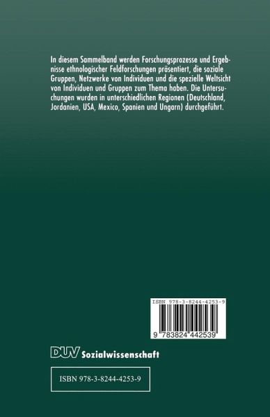 In diesem Sammelband werden Forschungsprozesse und Ergebnisse ethnologischer Feldforschungen präsentiert, die soziale Gruppen, Netzwerke von Individuen und die spezielle Weltsicht von Individuen und Gruppen zum Thema haben. Die Untersuchungen wurden in unterschiedlichen Regionen (Deutschland, Jordanien, USA, Mexico, Spanien und Ungarn) durchgeführt.