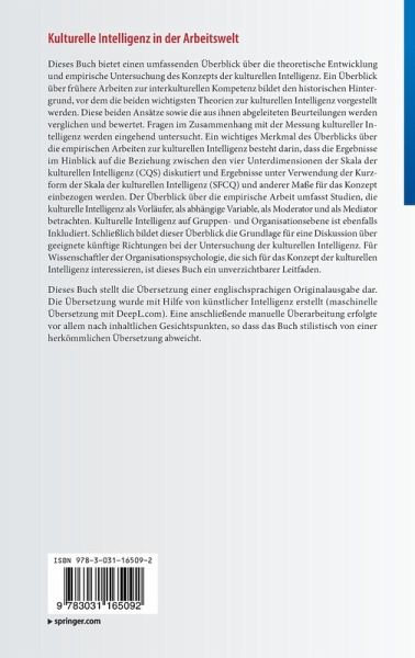 Teil I: Definition und Messung kultureller Intelligenz.- Kap. 1: Interkulturelle Kompetenz Tiefgreifender Hintergrund der interkulturellen Effektivität.- Kap. 2: Konzeptualisierung kultureller Intelligenz; Geschichte der Entwicklung des CQ-Konstrukts.- Kap.3: Messung kultureller Intelligenz; Vergleich zweier CQ-Messungen sowie anderer zeitgenössischer Messungen interkultureller Kompetenz (Effektivität).- Teil II: Antezedenzien der Ergebnisse kultureller Intelligenz.- Kap. 5: Ergebnisse kultureller Intelligenz; Überblick über theoretische und empirische Arbeiten.- Kap. 6: Kulturelle Intelligenz als Ergebnis Kap. 4: Antezedenzien kultureller Intelligenz; Überblick über theoretische und empirische Arbeiten.- Kap. 5: Ergebnisse kultureller Intelligenz; Überblick über theoretische und empirische Arbeiten.- Kap. 6: Kulturelle Intelligenz als Vermittler oder Moderator.- Teil II: Implikationen, Probleme und Möglichkeiten.- Kap. 7: Probleme und Kontroversen im Zusammenhang mit kultureller Intelligenz; Überblick über Kritiken an dem Konstrukt sowie über verschiedene Ansätze.- Kap. 8: Der Weg in die Zukunft.- Kap. 9: Fazit.