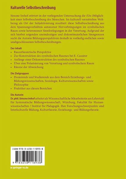 Simone Imhof erörtert in der vorliegenden Untersuchung die (Un-)Möglichkeit einer Selbstbeschreibung des Menschen. Im kulturell vermittelten Weltbezug als Ort der Subjektivierung resultiert diese Selbstbeschreibung aus dem Spannungsverhältnis autonomer Hervorbringungen im symbolischen Raum sowie heteronomer Sinnfestlegungen in der Verortung. Aufgrund der sich hierbei zeigenden uneindeutigen und diskontinuierlichen Sinngrenzen sucht die Autorin Bildungsperspektiven deshalb in vorläufig endlichen sowie unabgeschlossenen Selbstbeschreibungen.