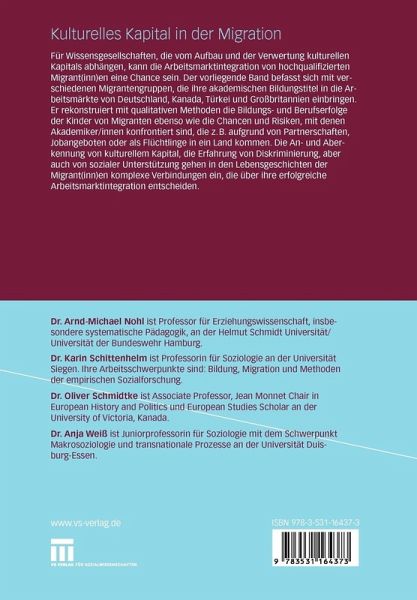 Zur Einführung: Migration, kulturelles Kapital und Statuspassagen in den Arbeitsmarkt.- Zur Einführung: Migration, kulturelles Kapital und Statuspassagen in den Arbeitsmarkt.- Die zweite Migrationsgeneration: Der schwierige Weg zum Bildungs- und Berufserfolg.- Statuspassagen in akademischen Laufbahnen der zweiten Generation.- Das kulturelle Kapital der Migrantenfamilie: Bildungsorientierungen der zweiten Generation akademisch qualifizierter Migrantinnen und Migranten.- Mit ausländischem Diplom auf dem Arbeitsmarkt: Komplexe Pfade jenseits der Greencard.- Hochqualifizierte BildungsausländerInnen in Deutschland: Arbeitsmarkterfahrungen unter den Bedingungen formaler Gleichberechtigung.- Zur Verwertung ausländischen Wissens und Könnens auf dem türkischen Arbeitsmarkt.- Die Sicht von ExpertInnen auf institutionalisiertes und inkorporiertes kulturelles Kapital im kanadischen Arbeitsmarkt.- Mehrsprachigkeit zahlt sich aus! Multi-legitimes Sprechen akademisch qualifizierter MigrantInnen in Deutschland und Kanada.- Arbeitsmarktinklusion unter erschwerten Bedingungen: Zur Lage von hochqualifizierten Flüchtlingen und Illegalisierten.- Die Erfahrung rechtlicher Exklusion. Hochqualifizierte MigrantInnen und das Ausländerrecht..- Zum Verlauf der Statuspassage hochqualifizierter BildungsausländerInnen mit nachrangigem Arbeitsmarktzugang in den deutschen Arbeitsmarkt.- Zwischen Dequalifizierung und Weiterbildung: Vergleichende Perspektiven auf BildungsausländerInnen.- Von der Bildung zum kulturellen Kapital: Die Akkreditierung ausländischer Hochschulabschlüsse auf deutschen und kanadischen Arbeitsmärkten.- Berufliche Integrationsförderung für immigrierte ÄrztInnen - Good Practice-Ansätze und die Entwicklung neuer Integrationsstrategien in Deutschland undGroßbritannien.- Teufelskreis im Ankunftsland: Zur Verstetigung hochqualifizierter MigrantInnen im Arbeitsmarkt für unspezifische Qualifikationen.- Diskriminierung: Zum Verlust kulturellen Kapitals durch rechtliche und symbolische Exklusion.- Migrationsbezogene biographische Orientierungen und ihre ausländerrechtliche Institutionalisierung.- Negativ wahrgenommene und klassifizierte Differenz. Zu Nichtanerkennungs-, Missachtungs- und Diskriminierungserfahrungen von BildungsinländerInnen in Kanada und Deutschland.- Symbolische Exklusion als Erfahrung von BildungsausländerInnen mit akademischem Abschluss.- Die paradoxen Auswirkungen des kanadischen Multikulturalismus auf Diskurse über symbolische Exklusion.- Die Verwertung sozialen Kapitals: Familien, Netzwerke und ihre Bedeutung für die Arbeitsmarktintegration.- Ethnisches kulturelles Kapital in der Arbeitsmarktintegration: Zwischen ethnischer Nischenökonomie und Übergang in den allgemeinen Arbeitsmarkt.- Mehr als "weak ties" - Zur Entstehung und Bedeutung von sozialem Kapital bei hochqualifizierten BildungsausländerInnen.- "Social Capital Matters" - als Ressource im bildungsbiographischen Verlauf der zweiten Generation.- Familiäre Orientierungen und Arbeitsmarktintegration von hochqualifizierten MigrantInnen in Deutschland, Kanada und der Türkei.- Sozialräumliche Koordinaten beruflicher Orientierung. Hochqualifizierte der zweiten Generation in Deutschland und Großbritannien.