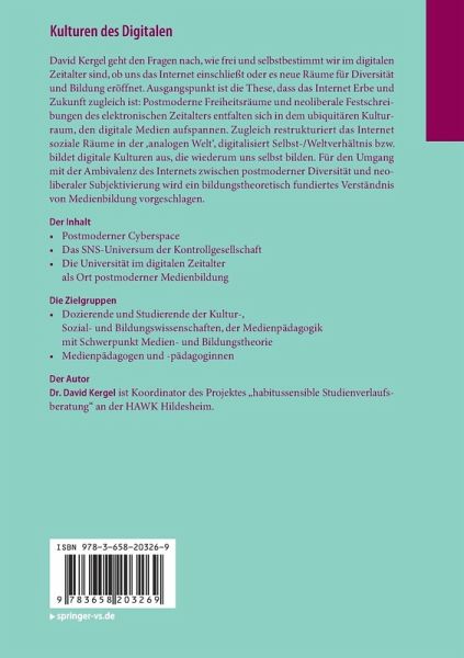David Kergel geht den Fragen nach, wie frei und selbstbestimmt wir im digitalen Zeitalter sind, ob uns das Internet einschließt oder es neue Räume für Diversität und Bildung eröffnet. Ausgangspunkt ist die These, dass das Internet Erbe und Zukunft zugleich ist: Postmoderne Freiheitsräume und neoliberale Festschreibungen des elektronischen Zeitalters entfalten sich in dem ubiquitären Kulturraum, den digitale Medien aufspannen. Zugleich restrukturiert das Internet soziale Räume in der 'analogen Welt', digitalisiert Selbst-/Weltverhältnis bzw. bildet digitale Kulturen aus, die wiederum uns selbst bilden. Für den Umgang mit der Ambivalenz des Internets zwischen postmoderner Diversität und neoliberaler Subjektivierung wird ein bildungstheoretisch fundiertes Verständnis von Medienbildung vorgeschlagen.