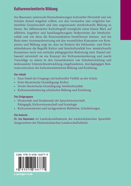 Ina Baumann untersucht Herausforderungen kultureller Diversität und wie Schulen darauf eingehen sollten, um den Lernenden eine möglichst barrierefreie Gemeinschaft und eine angemessene interkulturelle Bildung zu bieten. Ihr differenzierter Kulturbegriff ermöglicht einen klaren Blick auf affektive, kognitive und handlungsbezogene Stolpersteine der Interkulturalität und wie diese die Kommunikation beeinflussen können. Auf der Basis einer Auseinandersetzung mit den wesentlichen Konzepten wie Kompetenz und Bildung zeigt sie, dass im Kontext der Inklusions- und Diversitätsdiskurse die Begriffe Kultur und Interkulturalität bzw. interkulturelle Kompetenz noch von zentraler pädagogischer Bedeutung sind. Darauf aufbauend entwickelt sie ein Konzept der Kulturenorientierung und macht Vorschläge zu einem in den Gesamtkontext von Schulentwicklung und insbesondere Unterrichtsentwicklung eingebundenen, durchgängigen Rahmencurriculum der kulturenorientierten Bildung und Erziehung.