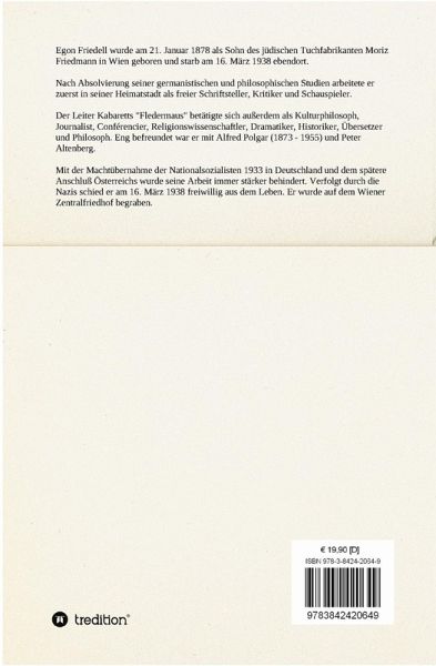 Egon Friedell wurde am 21. Januar 1878 als Sohn des jüdischen Tuchfabrikanten Moriz Friedmann in Wien geboren und starb am 16. März 1938 ebendort. Nach Absolvierung seiner germanistischen und philosophischen Studien arbeitete er zuerst in seiner Heimatstadt als freier Schriftsteller, Kritiker und Schauspieler. Der Leiter Kabaretts "Fledermaus" betätigte sich außerdem als Kulturphilosoph, Journalist, Conférencier, Religionswissenschaftler, Dramatiker, Historiker, Übersetzer und Philosoph. Eng befreundet war er mit Alfred Polgar (1873 - 1955) und Peter Altenberg. Mit der Machtübernahme der Nationalsozialisten 1933 in Deutschland und dem spätere Anschluß Österreichs wurde seine Arbeit immer stärker behindert. Verfolgt durch die Nazis schied er am 16. März 1938 freiwillig aus dem Leben. Er wurde auf dem Wiener Zentralfriedhof begraben.