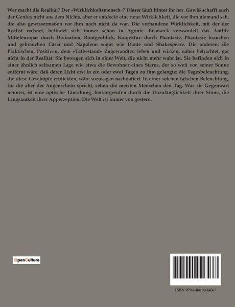 Wer macht die Realität? Der »Wirklichkeitsmensch«? Dieser läuft hinter ihr her. Gewiß schafft auch der Genius nicht aus dem Nichts, aber er entdeckt eine neue Wirklichkeit, die vor ihm niemand sah, die also gewissermaßen vor ihm noch nicht da war. Die vorhandene Wirklichkeit, mit der der Realist rechnet, befindet sich immer schon in Agonie. Bismarck verwandelt das Antlitz Mitteleuropas durch Divination, Röntgenblick, Konjektur: durch Phantasie. Phantasie brauchen und gebrauchen Cäsar und Napoleon sogut wie Dante und Shakespeare. Die anderen: die Praktischen, Positiven, dem »Tatbestand« Zugewandten leben und wirken, näher betrachtet, gar nicht in der Realität. Sie bewegen sich in einer Welt, die nicht mehr wahr ist. Sie befinden sich in einer ähnlich seltsamen Lage wie etwa die Bewohner eines Sterns, der so weit von seiner Sonne entfernt wäre, daß deren Licht erst in ein oder zwei Tagen zu ihm gelangte: die Tagesbeleuchtung, die diese Geschöpfe erblickten, wäre sozusagen nachdatiert. In einer solchen falschen Beleuchtung, für die aber der Augenschein spricht, sehen die meisten Menschen den Tag. Was sie Gegenwart nennen, ist eine optische Täuschung, hervorgerufen durch die Unzulänglichkeit ihrer Sinne, die Langsamkeit ihrer Apperzeption. Die Welt ist immer von gestern.