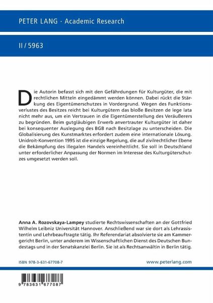Die Autorin befasst sich mit den Gefährdungen für Kulturgüter, die mit rechtlichen Mitteln eingedämmt werden können. Dabei rückt die Stärkung des Eigentümerschutzes in den Vordergrund. Wegen des Funktionsverlustes des Besitzes reicht bei Kulturgütern das bloße Besitzen de lege lata nicht mehr aus, um ein Vertrauen in die Eigentümerstellung des Veräußerers zu begründen. Beim gutgläubigen Erwerb anvertrauter Kulturgüter ist daher bei konsequenter Auslegung des BGB nach Besitzlage zu unterscheiden. Die Globalisierung des Kunstmarktes erfordert zudem eine internationale Lösung. Unidroit-Konvention 1995 ist die einzige Regelung, die auf zivilrechtlicher Ebene die Bekämpfung des illegalen Handels vereinheitlicht. Sie soll in Deutschland unter erforderlicher Anpassung der Normen im Interesse des Kulturgüterschutzes umgesetzt werden.