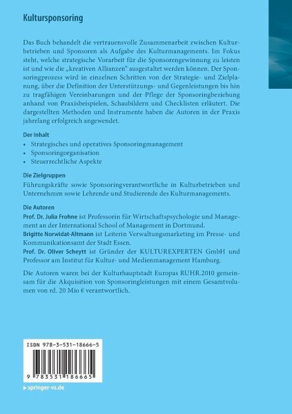 Das Buch behandelt die vertrauensvolle Zusammenarbeit zwischen Kulturbetrieben und Sponsoren als Aufgabe des Kulturmanagements. Im Fokus steht, welche strategische Vorarbeit für die Sponsorengewinnung zu leisten ist und wie die "kreativen Allianzen" ausgestaltet werden können. Der Sponsoringprozess wird in einzelnen Schritten von der Strategie- und Zielplanung, über die Definition der Unterstützungs- und Gegenleistungen bis hin zu tragfähigen Vereinbarungen und der Pflege der Sponsoringbeziehung anhand von Praxisbeispielen, Schaubildern und Checklisten erläutert. Die dargestellten Methoden und Instrumente haben die Autoren in der Praxis jahrelang erfolgreich angewendet.