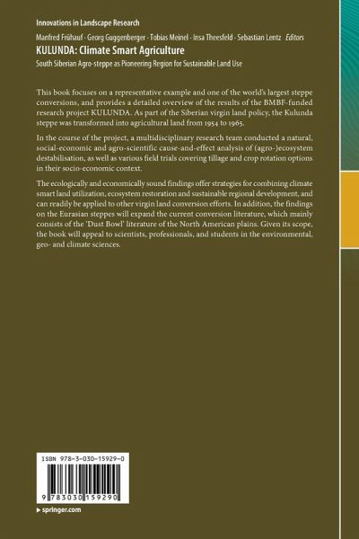 This book focuses on a representative example and one of the world's largest steppe conversions, and provides a detailed overview of the results of the BMBF-funded research project KULUNDA. As part of the Siberian virgin land policy, the Kulunda steppe was transformed into agricultural land from 1954 to 1965. In the course of the project, a multidisciplinary research team conducted a natural, social-economic and agro-scientific cause-and-effect analysis of (agro-)ecosystem destabilisation, as well as various field trials covering tillage and crop rotation options in their socio-economic context. The ecologically and economically sound findings offer strategies for combining climate smart land utilization, ecosystem restoration and sustainable regional development, and can readily be applied to other virgin land conversion efforts. In addition, the findings on the Eurasian steppes will expand the current conversion literature, which mainly consists of the 'Dust Bowl' literature of the North American plains. Given its scope, the book will appeal to scientists, professionals, and students in the environmental, geo- and climate sciences.